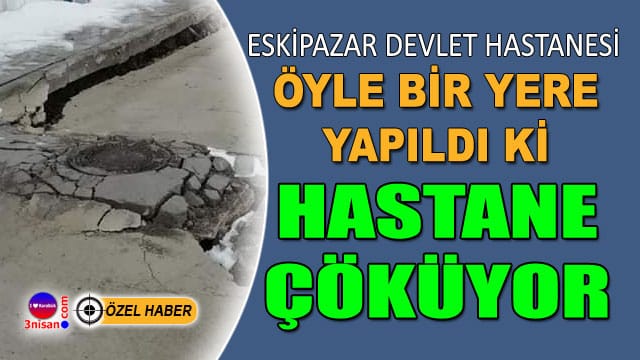 Yaklaşık olarak 12 Milyon TL’ye mal olan Eskipazar Devlet Hastanesi hizmete açıldıktan kısa süre sonra etrafında yer yer çökmeler başladı. Sağlık Bakanlığı yetkilileri çöken yerlere geçici tedbirler almaya çalıştı.