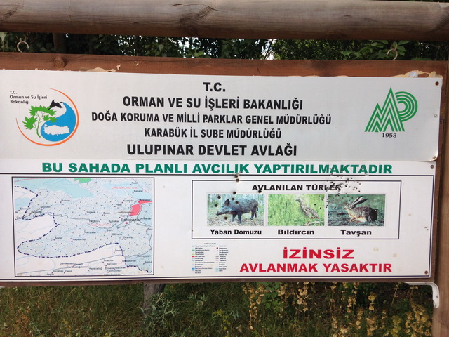 Orman ve Su İşleri Bakanlığı Doğa Koruma ve Milli Parklar Genel Müdürlüğü Karabük İl Şube Müdürlüğü tarafından oluşturulan ULUPINAR DEVLET AVLAĞI tabelası bulunuyor.